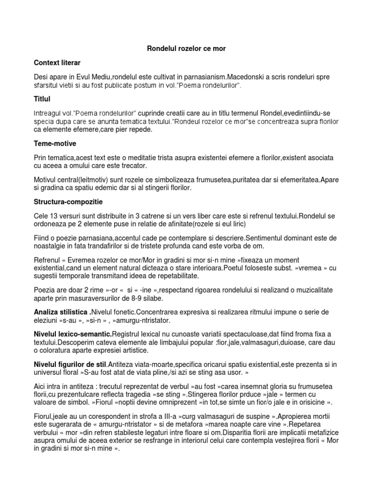 Antiteza creata sugereaza regretul si neputinta poetului de a schimba legile firii el se revolta. Rondelul a aparut in literatura medievala franceza si desemneaza la origine un cântec si un dans. Alexandru macedonski rondelul rozelor ce mor 1. In acceptia lui moderna rondelul este o poezie cu forma fixa având numai doua rime si un refren.