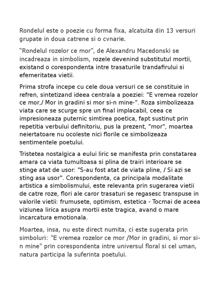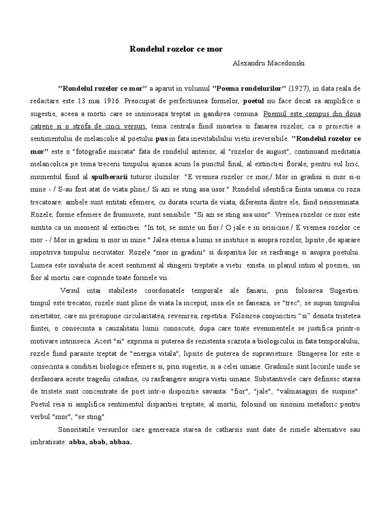 Rondelul rozelor ce mor tema. Rondelul rozelor ce mor respectă trăsăturile specifice rondelului. E vremea rozelor ce mor mor în grădini și mor și n mine. Poema rondelurilor is the title of a 1927 collection of rondel cycles by the romanian poet alexandru macedonski it contains the following rondels divided into the following cycles. în tot se simte un fior.