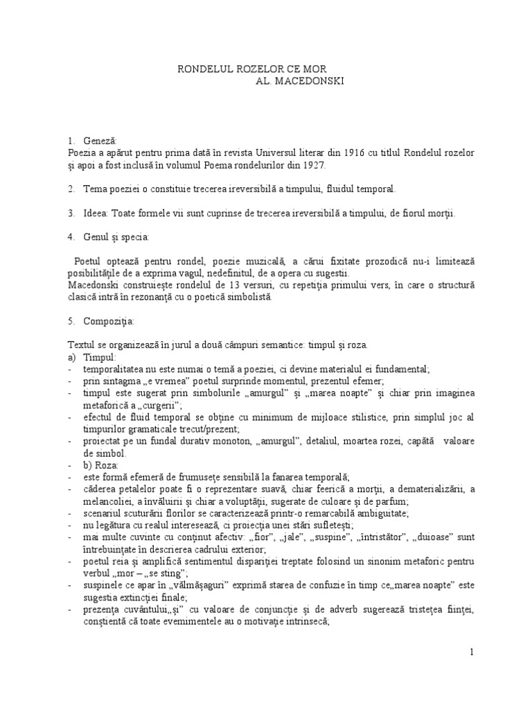E vremea rozelor ce mor mor în grădini si mor si n mine. Macedonski rondelul rozelor ce mor comentariu roza este un simbol al conştiinţei de sine este floarea albastră pe care o aducea în oglinda conştiinţei de sine în fântâna sufletului zeiţa isis aşa cum o găsim şi la mihail eminescu în floare albastră. Privita in profunzime tema poeziei o constituie moartea ca lege la care se supune intreg universal.