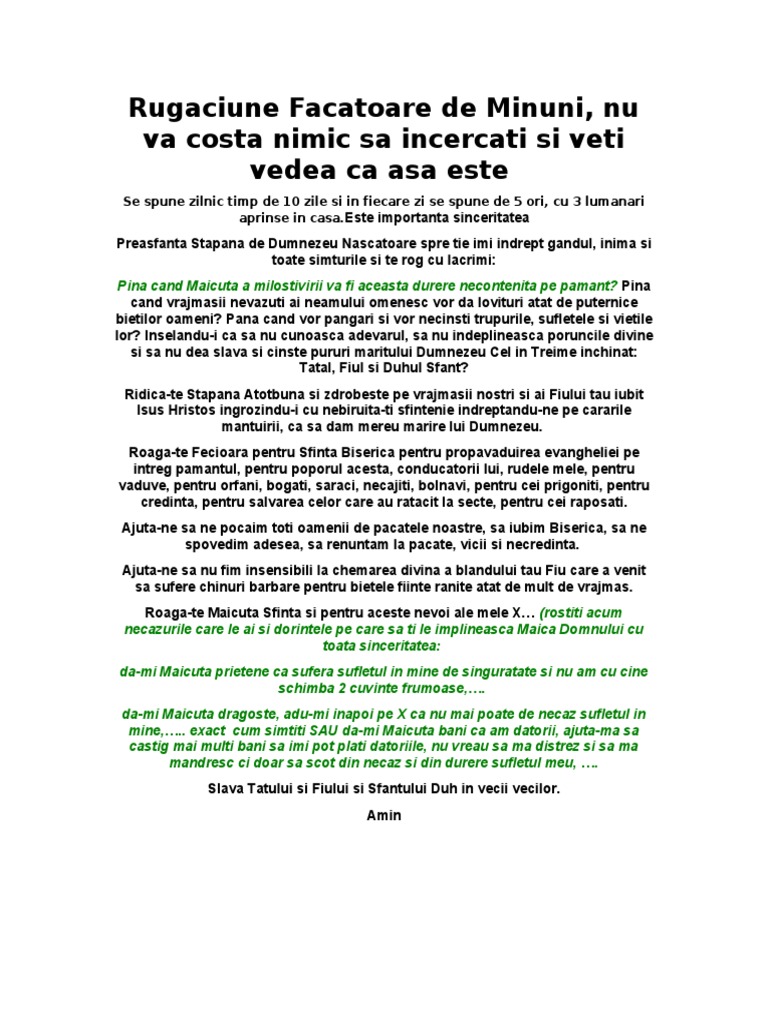 Cred cu tarie ca ma vei asculta in necazul meu si ma vei sprijini cand imi este greu. 10 rugaciuni facatoare de minuni fiecare la ce ajuta. Castigul vostru sa nu l cautati in zilele de sarbatoare pentru aceasta s au dat 6 zile lucratoare a saptea zi va fi duminica si va fi ziua de repaus si de rugaciune pentru ca sa se stie ca eu dumnezeu sunt nascut din fecioara maria intr o noapte sfanta iar eu am scris cu mana mea proprie aceasta rugaciune sfanta iar pentru cei rai care nu respecta cele 10 porunci vor fi blestemati cu. Conform credincioşilor dacă rosteşti în fiecare seară timp de o lună această rugăciune divinitatea îţi va asculta ruga.