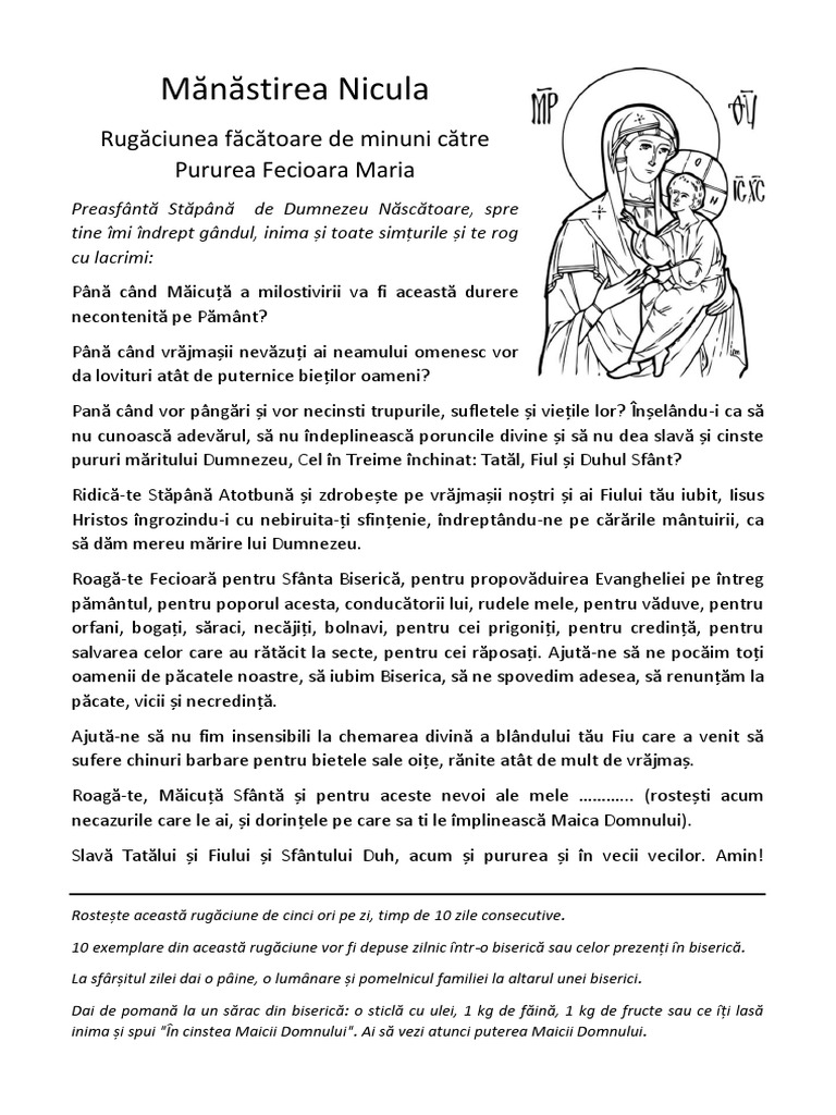 Rosteste aceasta rugaciune de cinci ori pe zi timp de zece zile consecutive zece exemplare din aceasta rugaciune vor fi depuse zilnic intr o biserica sau date la crestini prezenti din biserica.