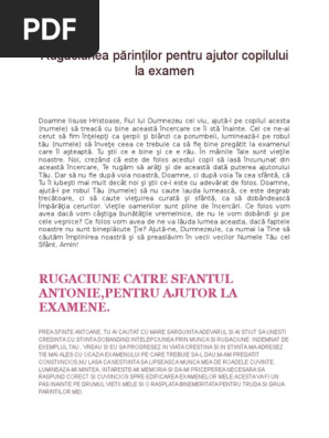 Asaza intru ei credinta tare invata i pe ei cucernicia inaintea ta si invredniceste i pe ei sa te iubeasca cu putere pe tine ziditorul si mantuitorul nostru. Dumnezeule parinte ceresc multindurat miluieste pe co piii nostri numele pentru care te ru gam cu smerenie si pe care ii lasam intr adins ocrotirii tale. Rugaciune catre sfantul antonie pentru ajutor la examene. Rugaciune a a ii a pentru copii.