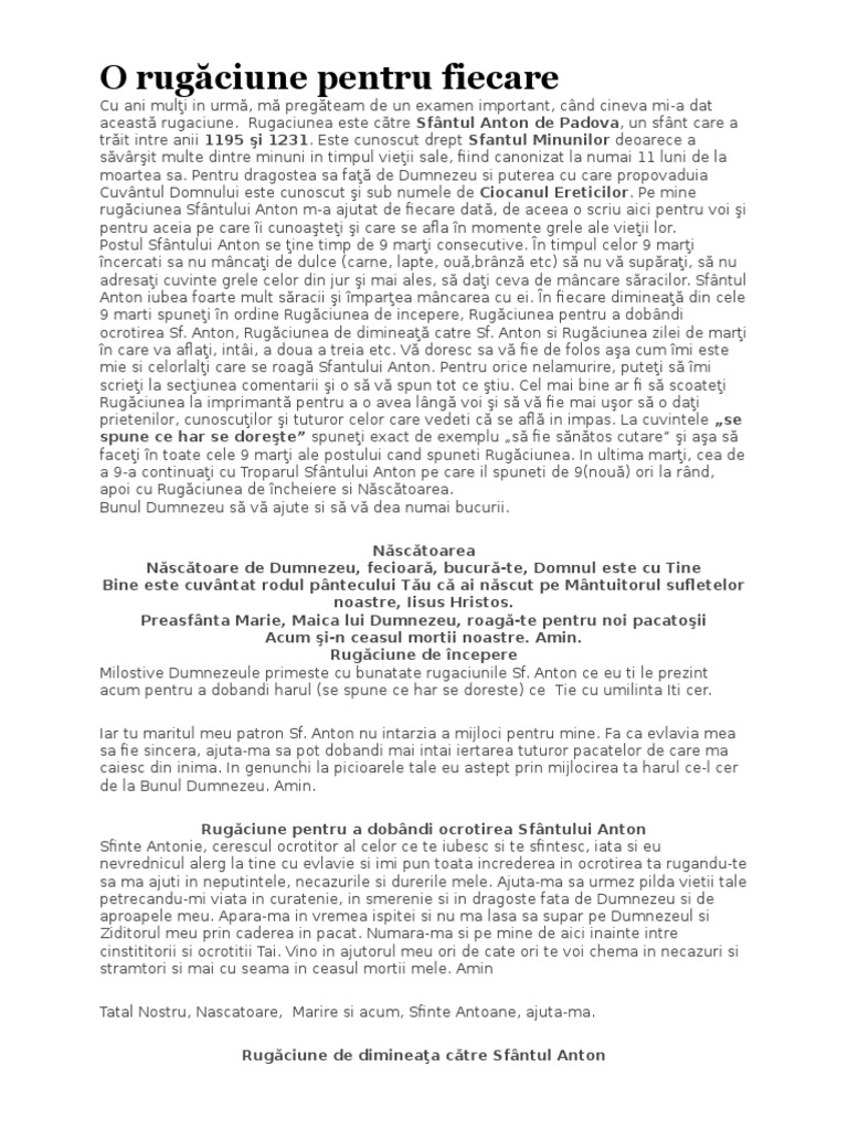 Rugaciunea sf anton 9 marti. Este vorba despre o rugăciune care se rostește în fiecare marți seară nouă săptămâni la rând în special pentru vindecarea rănilor sufletești. Anton cele 9 marti articole vezi toata rezulatele. Cel ce ai fost pe pamant si durerile noastre le sti si pacatele noastre le cunosti nu trece cu vederea glasurile de rugaciune ale celor ce alearga la mijlocirea ta si nu te uita la nevrednicia celor ce te roaga ci la slava si mila lui dumnezeu pe care tu l ai marturisit si spre care se indreapta rugaciunea ce ti o aducem cu atata nadejde.