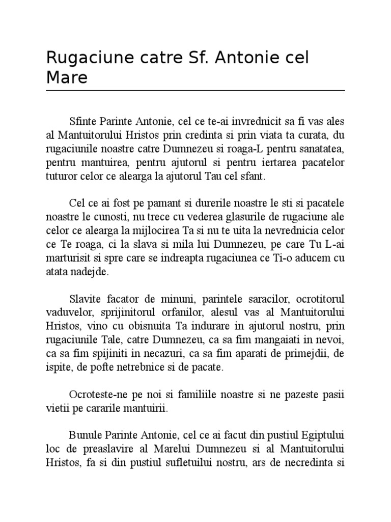 Rugaciune catre sfantul antonie cel mare. Rugăciune sfântului anton sfinte ocrotitor anton din suflet smerit te rugăm să ne alungi al vieții suspin cu puterea harului divin. Pe 17 ianuarie în fiecare an este prăznuit sfântul antonie considerat sfântul care îi scapă pe credincioși de farmece și blesteme. Sfântul antonie cel mare.