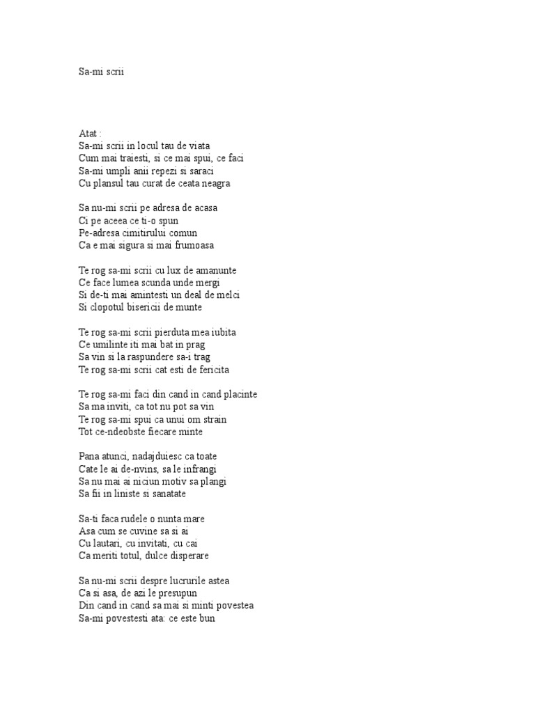 Sa mi scrii. Să mi scrii scrisori în fiecare seară pe frunze să îmi scrii cu promoroacă iar scrisul tau sa ti fie adorare. Traductions en contexte de poti sa mi scrii en roumain français avec reverso context. Când doruri se destramă cad frunze cadențat așează mi flori pe fiecare rană in zilele confuze. In unele situatii si blogul meu cinemil ro a oferit asta eu nu pot ajunge la vizionarea x deci trimit pe cineva in locul meu.