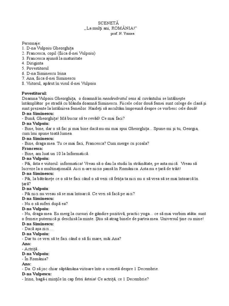 Sa insuflam acest sentiment de iubire de tara si pentru copiii nostri si va invitam sa invatati si sa recitati alaturi de ei cateva poezii pentru ziua de 1 decembrie. Ancorata in realitatea romaneasca sceneta aduce in atentia elevilor si a parintilor acestora ideea de dragoste fata de radacinile noastre. Asadar sa petrecem impreuna sa cantam si sa intindem hora mare. 0 stele 0 review uri.