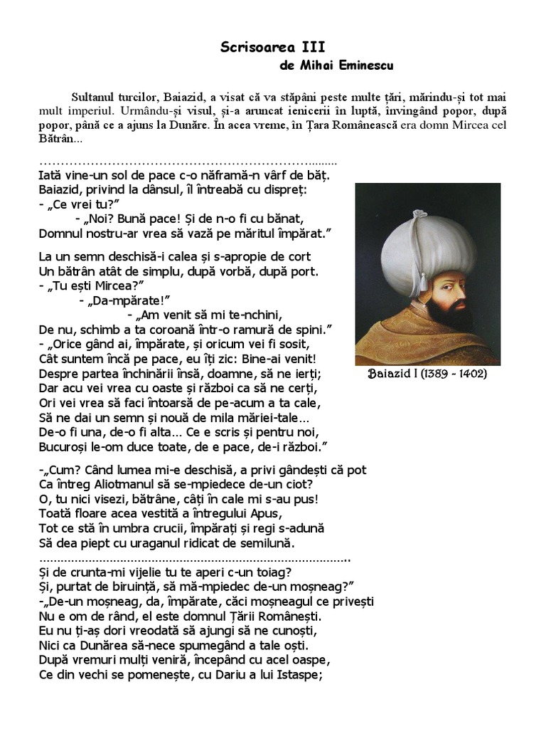Scrisoarea iii un sultan dintre aceia ce domnesc peste vro limbă ce cu a turmelor păşune a ei patrie ş o schimbă la pământ dormea ţinându şi căpătâi mâna cea dreaptă. Codrul clocoti de zgomot şi de arme şi de bucium iar la poala lui cea verde mii de capete pletoase mii de coifuri lucitoare ies din umbra ntunecoasă. Scrisoarea iii de mihai eminescu. 14 ianuarie 2020 11 august 2020 laura leave a comment on scrisoarea iii mihai eminescu facebook pinterest whatsapp linkedin email ca în fiecare an de ziua culturii naționale una dintre activitățile desfășurate va fi explorarea unui text din lirica eminesciană.