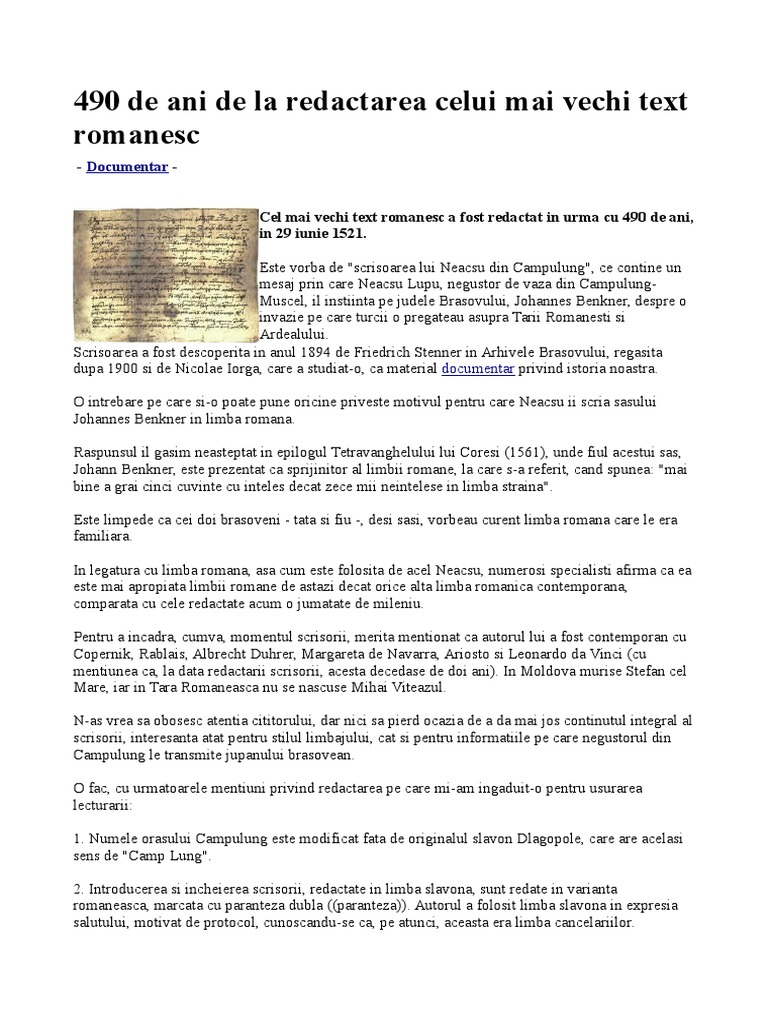 Scrisoarea lui neacsu din campulung comentariu. Cu 499 de ani în urmă la 29 iunie 1521 se redacta primul text în limba română cu caractere slavone care s a păstrat scrisoarea lui neacşu din câmpulung către johannes hans benkner judele braşovului a fost descoperită în 1894 de friedrich stenner în arhivele din braşov unde se păstrează şi astăzi şi a fost redactată cel mai probabil în 29 sau 30 iunie 1521 la. Preaînţeleptului şi cinstitului şi de dumnezeu dăruitului jupân hanăş bengner din braşov multă sănătate din partea lui neacşu din câmpulung n. ţara românească în vremea lui neagoe basarab. Scrisoarea a fost descoperită în anul 1894 de friedrich stenner în arhivele braşovului şi regăsită după 1900 de nicolae iorga care a studiat o ca material documentar privind istoria noastră.