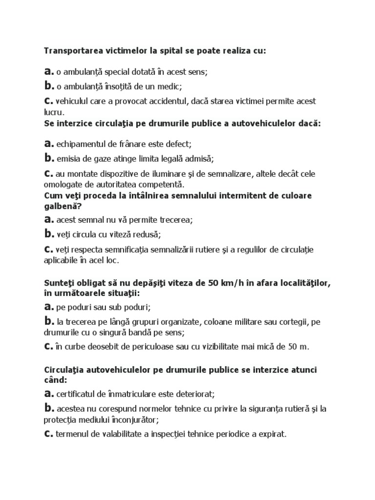 Se interzice circulaţia pe drumurile publice a autovehiculului dacă a. B autovehiculul are aplicate inscripţii desene semne distinctive sau reclame de natură să împiedice ori să diminueze eficacitatea dispozitivelor de iluminare şi de semnalizare luminoasă sau citirea numărului de înmatriculare. Se interzice circulaţia pe drumurile publice a autovehiculelor dacă. în acest caz se reține certificatul de înmatriculare sau înregistrare și se eliberează o dovadă înlocuitoare cu drept de circulaţie pentru 15 zile. A mecanismul de direcţie prezintă uzuri peste limitele admise.