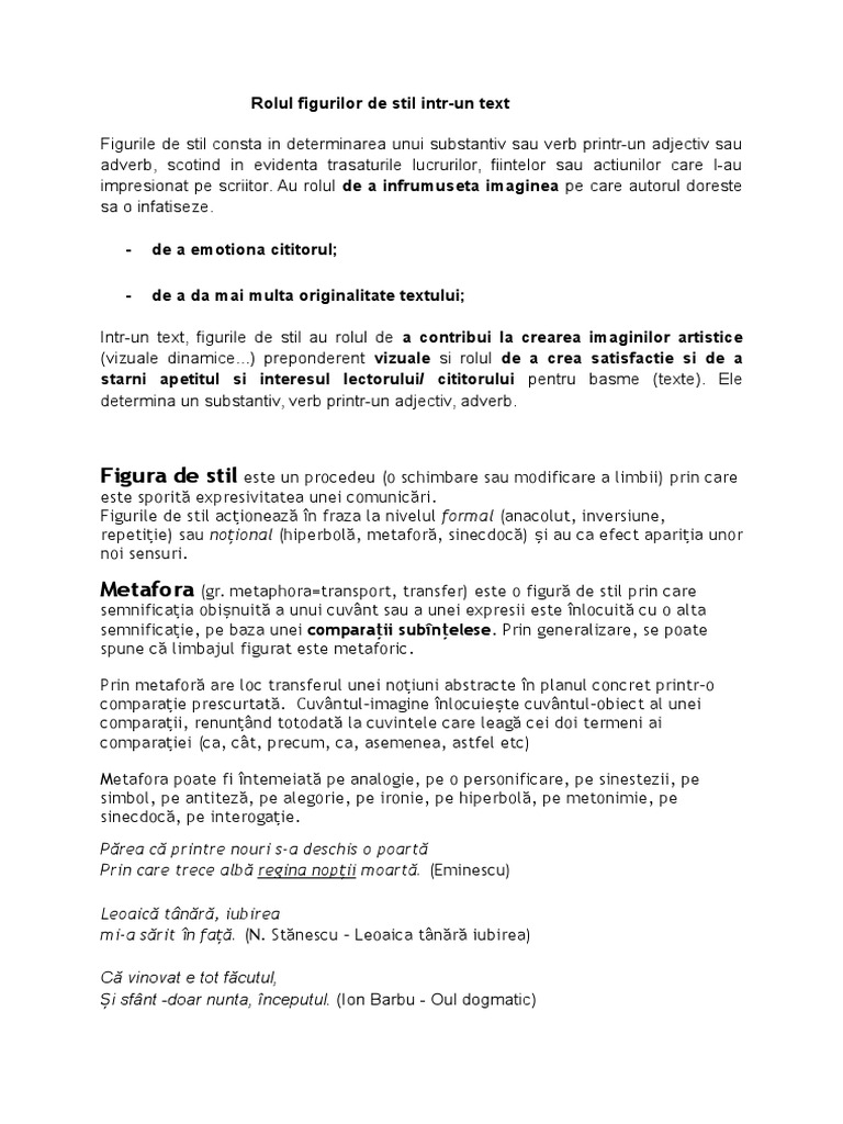 Figurile de stil pot fi definite drept cuvinte sau grupuri de. Astfel metafora ochiul de jăratic asociată cu adverbul numai şi cu comparaţia licăreşte ca o piatră de rubin conţine ideea de strălucire intensă sugerând fericirea din privirea şi sufletul îndrăgostitului. Trimisă pe 18 martie. Figurile de stil sunt procedee prin care se modifică înțelesul propriu al unui cuvânt sau construcția gramaticală uzuală pentru a da mai multă forță unei imagini sau expuneri.