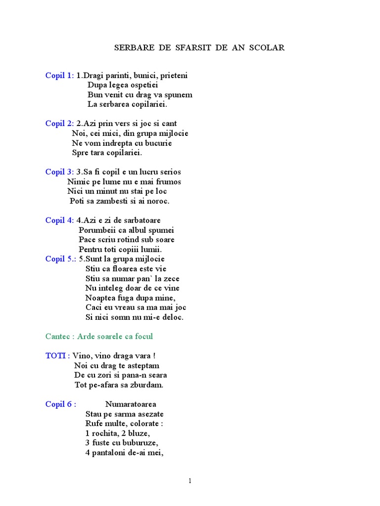 Acestea sunt versurile serbării noastre pentru sfârșitul de an școlar pentru grupa combinată. 13 mai 2017 08 06. 0 stele 0 review uri. Intr un sfarsit satul de cat a sforait se rasuci acum in pat.