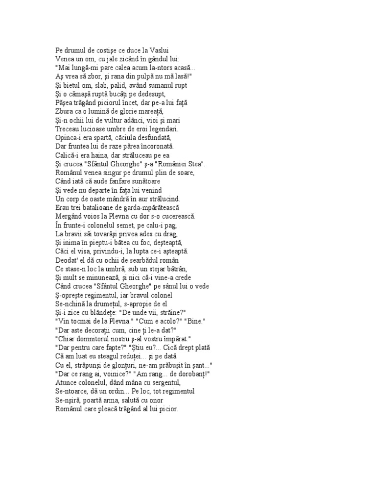 As vrea sa zbor si rana din pulpa nu ma lasa si bietul om slab palid avand sumanul rupt si o camasa rupta bucati pe dedesupt. Mai lungă mi pare calea acum la ntors acasă. Pe drumul de costişe ce duce la vaslui venea un om cu jale zicând în gândul lui. De vasile alecsandri.