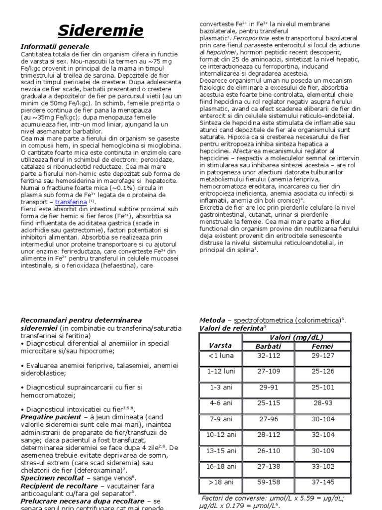 Organismul unui adult conține 4 5 g de fier din care cea mai mare parte 65 70 se găsește sub formă de hem care se combină cu diferite proteine alcătuind hemoproteinele hemoglobină mioglobină și enzime heminice care reprezintă forma funcționala activă a fierului. Valori letale 1800 µg dl sau 322 µmol l 2. Specialiștii susțin că o valoare normală a sideremiei la bărbați este de 70 175 mcg dl la femei de 50 150 mcg dl iar la copii de 50 120 mcg dl. De la legenda medievala europeana a lui john cel de fier pana la desenele animate cu popeye si notiunea ca devii mai puternic daca mananci spanac care contine fier fierul a fost asociat cu forta si vitalitate.