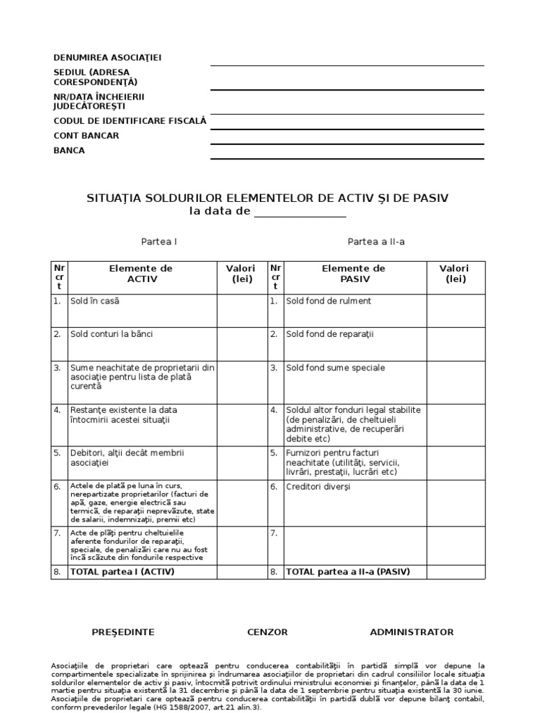 Situatia soldurilor elementelor de activ si pasiv la asoc de propr. Situația soldurilor elementelor de activ și de pasiv cod 14 6 30 d nomenclatorul registrelor și formularelor financiar contabile utilizate de persoanele juridice fără scop patrimonial care organizează și conduc contabilitatea în partidă simplă la reglementările contabile privind organizarea și conducerea contabilității în partidă simplă de către persoanele juridice fără. Asociaţiile de proprietari care optează pentru conducerea contabilităţii în partidă simplă vor depune la compartimentele specializate în sprijinirea si îndrumarea asociaţiilor de proprietari din cadrul consiliilor locale situaţia soldurilor elementelor de activ şi pasiv întocmită potrivit prevederilor ordinului ministrului economiei şi finanţelor nr. Nedepunerea bilantului contabil amenda de la administratia financiara.