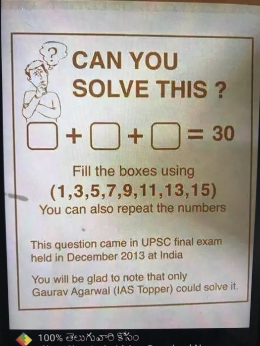 You will be glad to note that only gaurav agarwal ias topper could solve it. Fill the boxes using 1 3 5 7 11 gaurav agarwal s ias exam puzzle. Now use any 3 numbers from the above expression such that 30 since the ques. According to me the full questions seems like this if 1 3 5 7 9 11 13 15 64.
