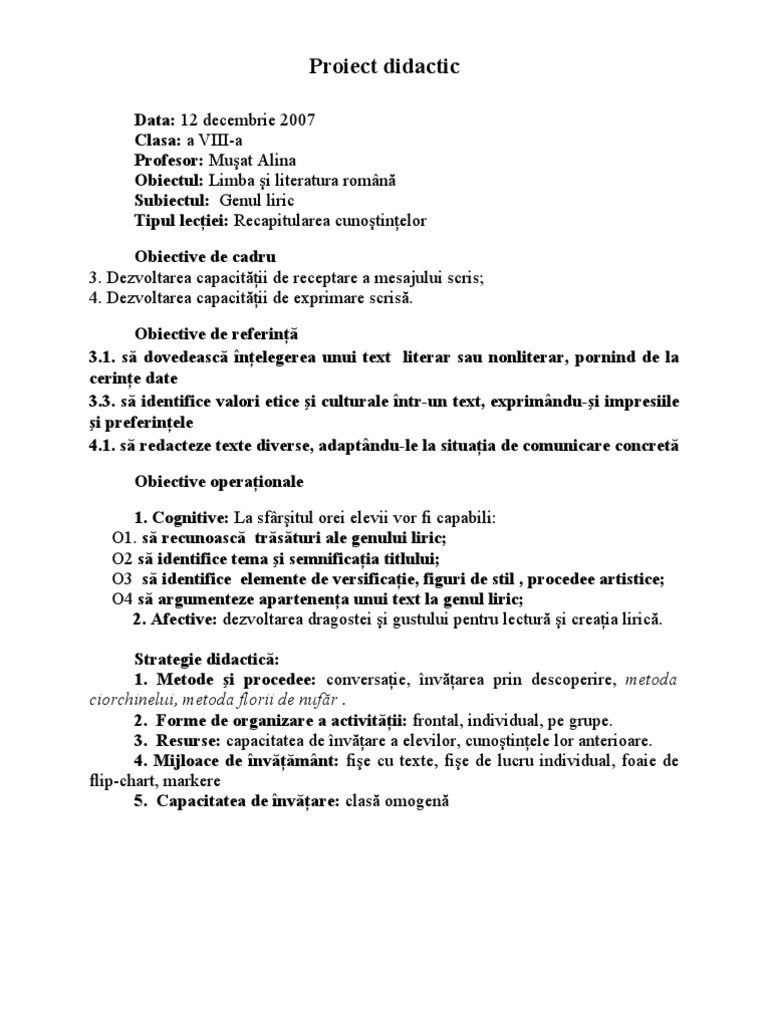 Evaluarea caracteristicilor genului liric. Modurile de expunere tipice sunt descrierea si monologul liric. In text sunt prezente marcile lexico gramaticale ale eului liric pronume si verbe la persoana i sau a ii a. La genul liric si speciile genului liric trebuie sa ai cate un paragraf cu eul liric figuri de stil si imagini artistice elemente de versificatie si moduri de expunere la genul epic si la speciile acestuia trebuie sa ai cate un paragraf despre narator actiune personaje timp si spatiu si moduri de expunere.