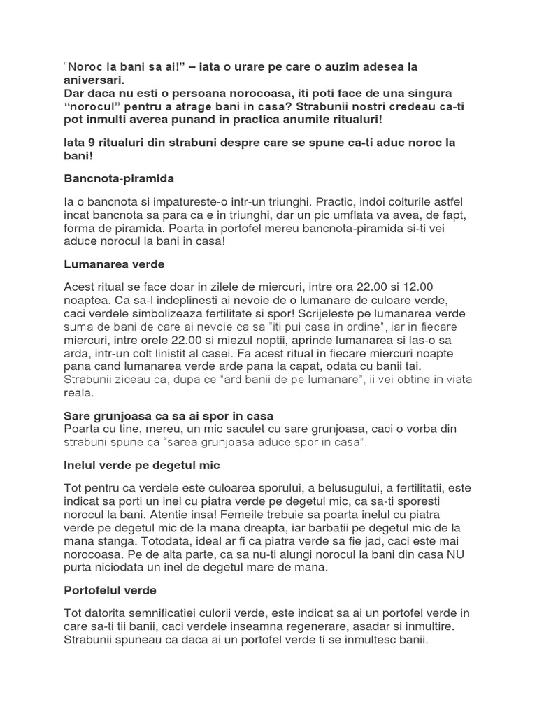 Poarta in portofel mereu bancnota piramida si ti vei aduce norocul la bani in casa. Tradiţii populare pentru a avea spor la bani. Așadar acum ai ocazia să verifici dacă plantele de pe pervazul tău îți aduc noroc la bani. Lumanarea verde acest ritual se face doar in zilele de miercuri intre ora 22 00 si 12 00 noaptea.