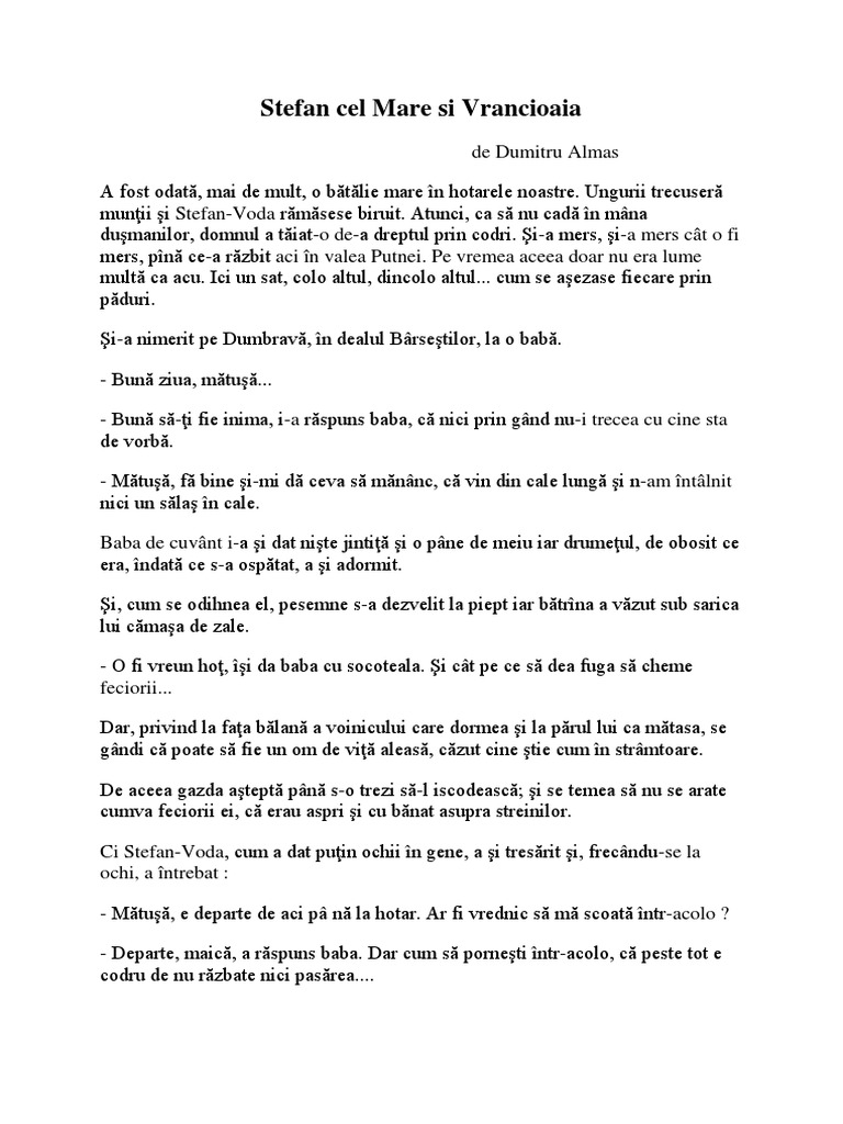 Era odată o babă vădană care avea şapte feciori. 7 au spus mulţumesc. Stefan cel mare si vrancioaia. Actualizat de anidescoala ro pe 1 martie 2015.