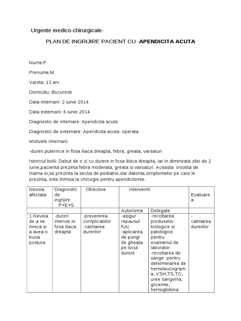Studiu de caz apendicita acuta. Acasa student center lucrari de licenta ingrijirea pacientilor cu apendicita acuta ingrijirea pacientilor cu laringita acuta evolutia laringitei acute edematoase este variabila in raport cu precocitatea diagnosticului si a tratamentului cu virulenta agentului patogen si cu puterea de rezistenta a organismului individului. Iti recomandam sa te uiti bine pe extras cuprins si pe imaginile oferite iar daca este ceea ce ti trebuie pentru documentarea ta o poti descarca. 2 iunie 2013 data externarii. Apendicita acuta operata motivul internarii.